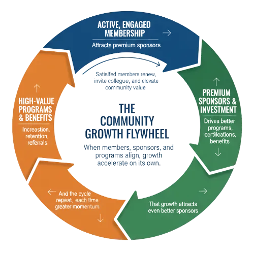 Satisfied members renew, invite colleagues, and elevate the community’s value. That growth attracts even better sponsors. And the cycle repeats, each time with greater momentum.